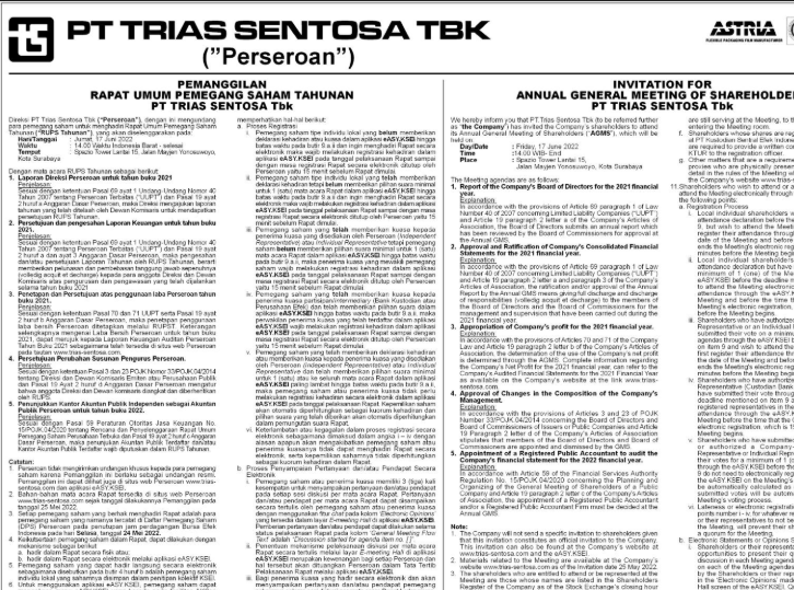 2.Untuk informasi lebih lanjut mengenai Paparan Publik ( Public Expose ) dapat menghubungi kami melalui email corsec@trias-sentosa.com
