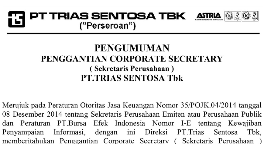 Perusahaan patungan (Joint Venture) PT Trias Sentosa Tbk (Perseroan) dengan Toyobo Co.,Ltd. diresmikan pada Jumat lalu, 25 Oktober 2019.